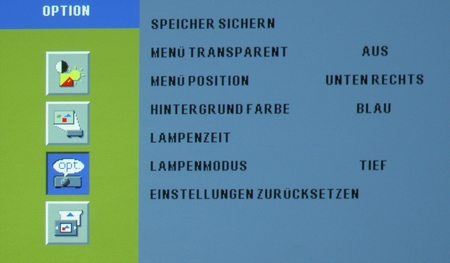 Die dritte Rubrik bietet diverse Funktionen, um die Bedienung auf den persönlichen Geschmack abzustimmen: Unter „Speicher sichern“ lassen sich alle vorgenommenen Einstellungen dauerhaft in drei verschiedenen Speicherbänken absichern. Der einzige für die Bilddarstellung relevante Parameter dieses Menüs ist der „Lampenmodus“: Hier kann die Lampenhelligkeit auf die Raumbedingungen und Leinwandgröße angepasst werden („Normal“ / „Tief“).