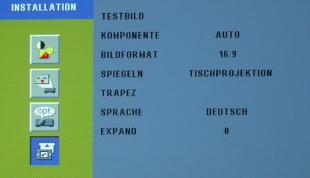 Als letzte Rubrik verbleibt das Installations-Menü des HC2000. Hier werden weiterführende Signal- und Bildparameter zur Verfügung gestellt: Praktisch ist das eingebaute „Testbild“, das bei der Justage der optischen Bildschärfe behilflich ist. Mit „Komponente“ können die BNC-Eingänge des Projektors auf eine bestimmte Signalart festgelegt werden (YUV bzw. RGB H/V). Die Funktionen „Spiegeln“ und „Trapez“ dienen zur Auswahl und Anpassung der verwendeten Aufstellungsart. Für den täglichen Gebrauch wichtig ist die Funktion „Bildformat“, fünf verschiedene Varianten stehen dabei zur Auswahl: - „16:9“: Für die Bildfüllende Darstellung von anamorph aufgezeichnetem Bildmaterial (meist von DVDs). - „Zoom 1 / 2 / 3“: Zur Anpassung verschiedener Kinoformate (CinemaScope / Vista-Vision) - „Real“: Zur originalgetreuen Bilddarstellung herkömmlicher Signale.