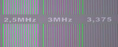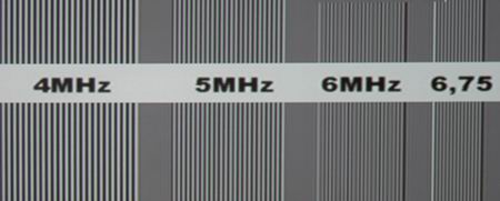 In der Horizontalen müssen aus den maximal 720 Pixeln unseres PAL-Standards 1280 Pixel (native Auflösung des HC2000) gemacht werden. Diese Umrechnung provoziert im Idealfall keine störenden Interferenz-Erscheinungen. Mit Hilfe von Burst-Testbildern lässt sich die Skalierung veranschaulichen: