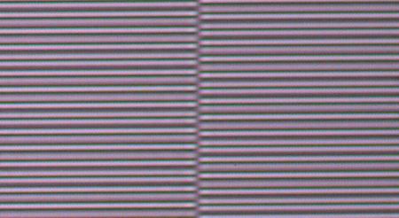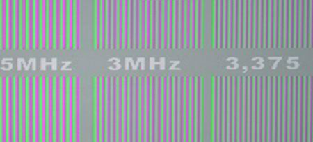 Analog Bei analogen Eingangssignalen vollzieht der HC2000 die Skalierung mit guten Ergebnissen. Auch im kritischen Bereich von 6MHz sind keine Linearitätsschwankungen zu erkennen. Allerdings sind die Bildschärfe und Helligkeit in den hohen Auflösungen (rechts im Bild) leicht reduziert und führen so zu einem leichten Dynamikverlust in kleinen Details, wie z.B. feine Strukturen oder Schriften in einem Film. Im Testbild oben ist dieser Verlust in der höchsten Auflösung rechts zu erkennen: Die farbigen Linien sind nicht mehr klar voneinander getrennt, sondern erscheinen grau. Im analogen Bereich ist die Detaildarstellung des HC2000 damit gut aber ohne das letzte „Quentchen“ Schärfe.