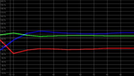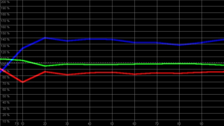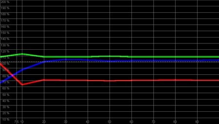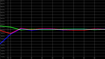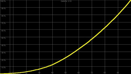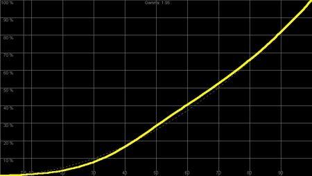 Eine große Nachkorrektur wie bei der Farbtemperatur ist damit nicht notwendig. Wer dennoch eine andere Gammacharakteristik erreichen möchte, dem stehen mit der „Schwarzausdehnungs“-Funktion und den bekannten Helligkeits- und Kontrastreglern diverse Möglichkeiten zur Verfügung. Gammaanstiege von bis zu 2,4 sind so realisierbar.