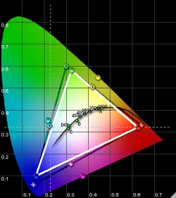 Über alle Helligkeiten (von Schwarz bis Weiß) ist die Farbtemperatur zwar homogen, doch zeigt sich ein deutlicher Rotmangel. Die Farbtemperatur beträgt nicht die erforderlichen 6500K, sondern 7900K: