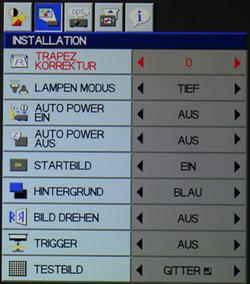 Von weiterem Interesse sind in dieser Rubrik der Lampenmodus, die Bildausrichtung sowie ein integriertes Gitter-Testbild, das die optische Schärfe- und Zoomjustierung bei der Aufstellung ungemein erleichtert.