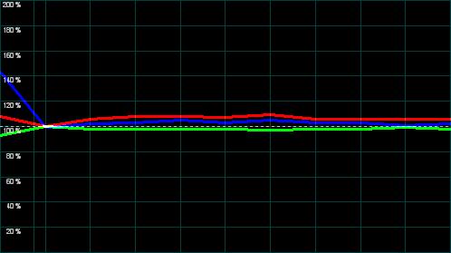 Das Preset "Hoch" hingegen erzeugt folgerichtig eine wesentlich höhere Farbtemperatur mit größerem Blauanteil (+40%). Auch wenn dieses Preset gemäß der Videonorm keine akkurate Farbreproduktion gewährleistet, kommt es so manchen Sehgewohnheiten nahe.