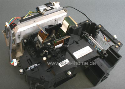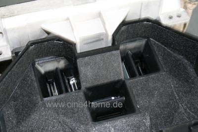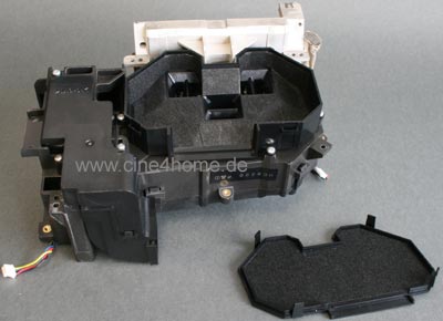 Das obige Bild zeigt die Unterseite des Lichtweges mit Belüftungsschacht. Die drei einzelnen quadratischen Löcher sind die Luftkanäle zu den LCD-Panels. Diese untere Luftkammer ist beim HC6000 neu mit einer speziellen Kunstfaser ausgekleidet.