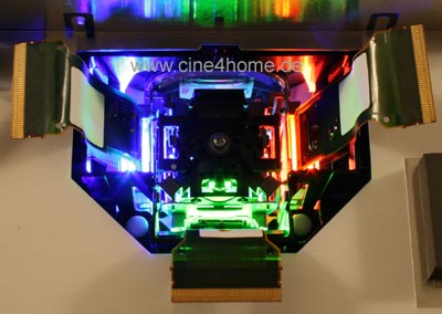 Im Bild oben sieht man den verkapselten Lichtweg mit seinen drei LCD-Panels zur Bilderzeugung, erkennbar an den grünen Flachbandkabeln. Im angeschalteten Zustand sieht man, welches Panel für welche Farbe zuständig ist.