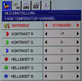 Die erste Rubrik "Image" beinhaltet, wie der Name schon sagt, alle wesentlichen Parameter zur Bildjustage. Kontrast, Helligkeit sowie die Gamma-Verteilung und Weißabgleich können hier abgestimmt werden. Neue Funktionen gibt es wenige, dafür aber umso sinnvollere: In unserem damaligen Test des HC5000 haben wir bemängelt, dass die Farbtemperatur der Presets nicht weiter justiert werden kann. Dies ist beim HC6000 anders, nun kann jedes der drei Presets mit RGB-Gain- und Bias Reglern feinkalibriert werden.
