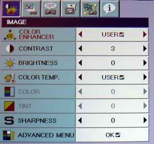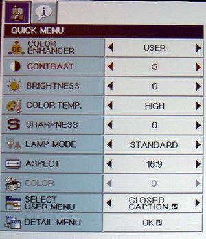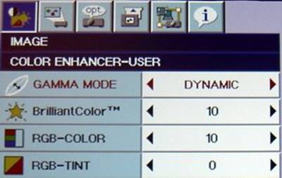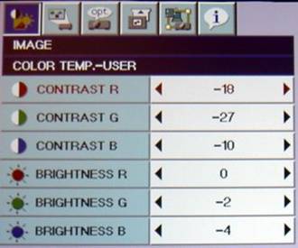 Mit einer perfekten Farbwiedergabe hat dies wenig zu tun, allerdings liegen die Abweichungen für einen EM-Beamer noch im tolerablen Rahmen, denn: Bei einer Sportübertragung im nicht abgedunkelten Raum ist eine genaue Farbreproduktion des Livebildes ohnehin eine Utopie. Anders sieht es aus, wenn man unter kontrollierten Lichtbedingungen einen Spielfilm genießen will. Hierfür gilt es, das alternative Setting zu finden, bei dem die Farbdarstellung genauer ausfällt und die Lichtleistung moderater ist. Wenn man weiß, „wo man drehen“ muss, ist dies auch gar nicht so schwierig. Man geht ins Bildmenü und wählt Farbtemperatur „User“. Nun geht man ins Untermenü und kann per RGB-Regler den Grünstich reduzieren.