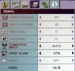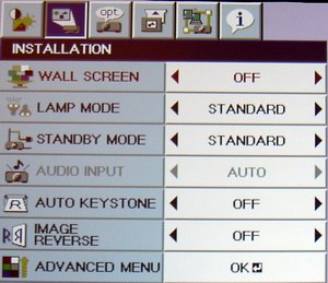 In der zweiten Kategorie können weitere Darstellungs- und Aufstellungsoptionen des Projektors genutzt werden. Eine automatische Trapez-Korrektur ermöglicht eine schräge (aber nicht empfohlene) Aufstellung des Projektors. Von weiterem Interesse sind in dieser Rubrik der Lampenmodus, die Bildausrichtung sowie ein Farbanpassung auf die Tapete, falls man keine neutralweiße Wand zur Verfügung hat. Die dritte Kategorie beinhaltet unter anderem weitere Signalanpassungsmöglichkeiten (z.B. Bildformat). Interessant ist die Funktion "Cinema Mode", der irreführend bezeichnet ist und tatsächlich den De-Interlacer beeinflusst.