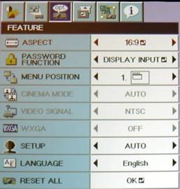 2. Bedienung Weiterhin nicht verändert hat sich die bewährte Menüstruktur, die schon seit Generationen aus einer vertikalen Anordnung von Symbolen und Beschriftungen besteht. Lediglich die Anordnung der Parameter ist hier mehr auf Business-Anwendungen ausgelegt, als auf Heimkino.