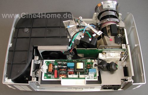 Alle günstigen HD-DLP Projektoren haben eines gemeinsam, in ihnen sorgt der neue 1280x768 Pixel DMD aus dem Hause Texas Instruments für die Bilderzeugung. Dies ist nicht nur genügend für die Darstellung von HD-Material, sondern auch für die unkomprimierte Anzeige von XGA PC-Signalen (1024x768). Das Panel im 16:10 Format macht somit den Projektor zu einem Allrounder für Freizeit und Business. Interessant ist bei DLP-Projektoren immer der innere Aufbau, da er nicht selten variiert. Wir haben den HD72i geöffnet, um seine Technik anschaulich zu erklären: Nach dem Öffnen fällt der besonders große Luftkanal auf der linken Seite ins Auge, daneben befinden sich der Lichtweg und die abdeckende Signalelektronik.