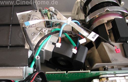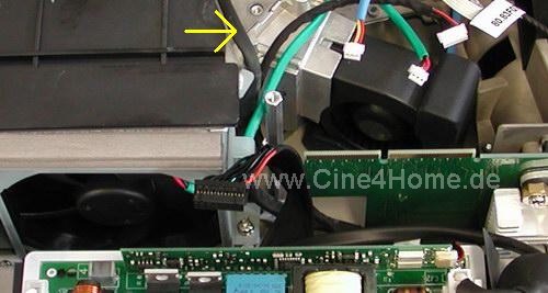 Unterstützt wird die Kühlung durch einen zweiten Lüfter, der direkt die Lampe durch einen kleinen Luftkanal (gelbe Pfeile) mitversorgt.