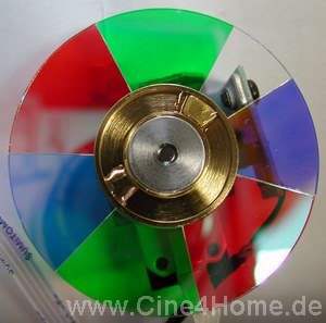 Im Bild oben zu sehen ist das Farbrad mit seinem Weißsegment, welches einfach aus transparentem Glas besteht. Die Rotfilter sind ein wenig vergrößert, um den Rotmangel der Lampe in einem gewissen Maß auszugleichen. Die relativ großen Grünsegmente zeigen aber, dass der Schwerpunkt nicht auf Farboptimierung, sondern auf Helligkeit gelegt wurde.