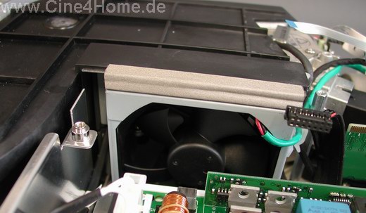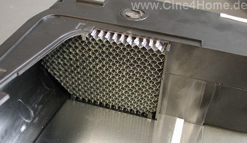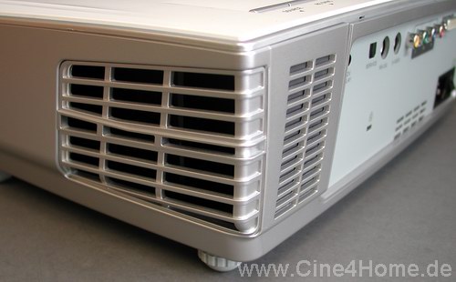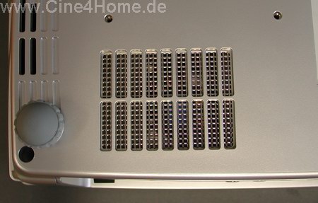 Das Kühlprinzip des HD72i ist besonders durchdacht: Wie im Bild oben zu erkennen, befinden sich direkt neben dem DMD-Kühlkörper Luftschlitze nach Außen. Durch sie wird die nötige Kühlluft direkt angesaugt. Weitere Kühlschlitze befinden sich auf de Unterseite des Gerätes, mit einem davorliegenden Schutzgitter.