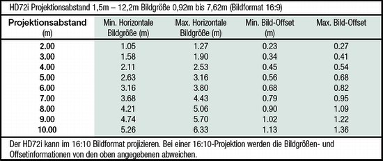 In der Aufstellung zeigen DLP-Projektoren nach wie vor deutlich weniger Flexibilität als ihre LCD-Konkurrenten. Dies gilt leider auch für den Optoma HD72i. Der kostengünstige Aufbau des Lichtweges ohne Glasprisma hat einen großen vertikalen Offset zur Folge. Dies bedeutet, dass der Projektor das Bild leicht schräg nach oben (Tischaufstellung) bzw. nach unten (Deckenmontage) projiziert, zudem fehlt ein mechanischer Lensshift. Ein wenig Abhilfe schafft zum Glück ein "digitaler Lens-Shift": Da die native vertikale Auflösung des Projektors 768 Pixel beträgt, die Videodarstellung aber nur 720 Pixel benötigt, verbleiben 48 Pixel zur nachträglichen vertikalen Bildverschiebung. Wer mehr Ausgleich benötigt, der kommt um ein Schrägstellen des Projektors nicht herum. Zu diesem Zweck sind alle vier Füße des Projektors in ihrer Höhe verstellbar.