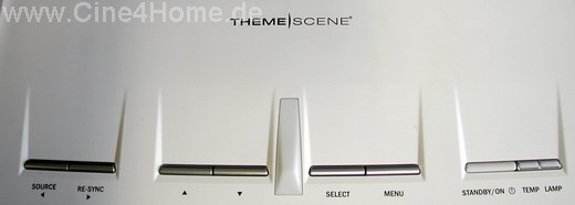 Sehr übersichtlich und durchdacht strukturiert ist auch die Tastenanordnung: Im oberen Drittel befinden sich alle wesentlichen Funktionen zur schnellen Bildanpassung bei der Installation, in der Mitte das Steuerkreuz mit Menü-Tasten und im unteren Drittel Formatumschaltungen und direkte Quellwahltasten. So sollte eine Fernbedienung aufgebaut sein, um schnell intuitiv und im alltäglichen Gebrauch nutzbar zu sein. Was leider nicht so vorbildlich ausgefallen ist, ist die Reichweite des Infrarotgebers. Er funktioniert nicht reflektiv über die Leinwand, so dass mit der Fernbedienung immer direkt auf den Projektor gezeigt werden muss. Und nicht nur das, man muss schon relativ genau "zielen", um die gewünschten Signale dem Projektor zu übermitteln. Gerade bei Deckenmontagen über bzw. hinter dem Zuschauer kann dies so schnell zu einem Ärgernis werden. Wir können solche Mankos nach wie vor nicht in der Preisklasse von Videoprojektoren verstehen, so "teuer" können leistungsfähige IR-Sender und Empfänger als Elektronikbauteile nicht sein, als dass der Hersteller hier sparen müsste. Vorbildlich widerum sind die funktionellen und zugleich ansprechend gestalteten Tasten auf der Geräteoberseite. Ist die Fernbedienung einmal nicht zur Hand, kann der Projektor so auch bequem direkt gesteuert werden.