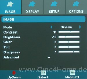 2.2 Menüs Ebenfalls große Fortschritte sind in der Menüstruktur zu verzeichnen. Nach Jahren hat Optoma erstmals die Struktur komplett überarbeitet, sowohl grafisch als auch inhaltlich. Alle Funktionen sind nun in vier Hauptkategorien eingeteilt: Image, Display, Setup und Options.