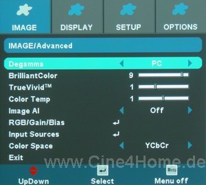 Bei der Bewertung des Bildes setzen wir unsere bekannten Schwerpunkte. In Schwarzwert und Kontrast liefert der Projektor keine überragenden Ergebnisse, bietet aber die für DLP typische hohe Bildtiefe, die kaum Wünsche offen lässt. Nur in ganz dunklen Szenen müssen Abstriche gemacht werden. Die Gammaverteilung ist je nach Preset ansprechend und bewirkt eine akkurate Lichtverteilung im Bild, doch die gebotenen Einflussmöglichkeiten sind gering. Ein wenig enttäuschend ist die Signalverarbeitung, die nur digital die Schärfe der Zuspielung komplett ausnutzt und bei HDMi YPbPr Zuspielung einen störenden Chromabug aufweist.