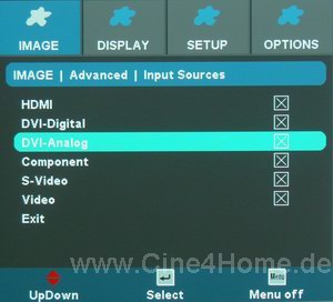 Eine praktische Funktion ist "Input Sources", die allerdings wohl versehentlich in das Bildmenü gerutscht ist, denn inhaltlich wäre sie besser bei "Setup" oder "Options" aufgehoben gewesen. Hier kann schnell festgelegt werden, welche Eingänge des Projektors tatsächlich mit Signalquellen belegt sind.