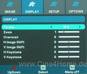 Wie der Screenshot oben schon zeigt, sind hier alle Parameter für eine genaue Anpassung an Leinwand und Signalquelle vorhanden, teils irreführend sind allerdings die Bezeichnungen. Die Funktion "Format" ist selbsterklärend, 16:9, 4:3, Native und LBX (Letterbox) stehen zur Auswahl. "Zoom" ist zwar eine korrekte Umschreibung, passender wäre hier allerdings die Bezeichung "Overscan" gewesen. Mit dem Zoom kann der anzuzeigende Bildausschnitt ausgesucht und somit die abgeschnittenen Ränder ausgewählt werden. Hinter der Funktion "Overscan" widerum verbirgt sich eine Blanking-Funktion, mit der die Bildränder eingeschwärzt werden können. Dies ist besonders praktisch bei störenden Signalstreifen oberhalb des Bildes, verursacht z.B. durch Teletextinformationen. Mit "H/V-Image Shift" kann das Bild horizontal und vertikal verschoben werden. Hiermit ist bereits erwähnter digitaler Bildshift möglich, mit dem der Offset des Projektors bei der Video (720p) Darstellung variiert werden kann. Mit "H/V-Keystone" letzendlich kann eine Schrägstellung des Projektors ebenfalls in beide Richtungen ausgeglichen werden.