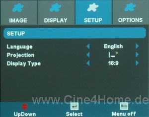 Die Hauptrubrik "Setup" (Bild oben) beinhaltet Funktionen, die bei dem erstmaligen Einrichten des Projektors zu beachten sind. Neben Sprache und Projektionsmodus (Decke / Boden / Front / Rück) kann der Awender hier aussuchen, ob Videomaterial mit nativer HD-Auflösung und Format (1280x720 / 16:9) oder voller Projektoren-Auflösung (1280x768 / 16:10) dargestellt werden soll. Dies ist besonders bei der Darstellung von 4:3 Signalen sinnvoll, da hier die vertikale Auflösung auf 768 Pixel gesteigert werden kann.