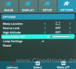 Es verbleibt das "Options"-Menü (Bild oben), das alle restlichen Funktionen des Projektors zur Auswahl stellt. Mit "Menu Location" kann das OS-Display innerhalb des Bildes verschoben werden, "Source Lock" zwingt den Projektor auf den gerade ausgewählten Eingang, auch wenn kein Signal anliegt. Mit dieser Funktion kann demnach die automatische Quellensuche deaktiviert werden. "Auto Power Off" ist für vergessliche Nutzer gedacht, aktiviert man diese Funktion, schaltet sich der Projektor bei fehlendem Eingangssignal automatisch nach wenigen Minuten ab.