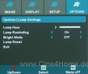 "Lamp Settings" öffnet ein spezielles Untermenü (Bild oben), in dem die Lampenstunden abgelesen, eine Erinnerungsfunktion bei bevorstehendem Lampentausch und der "Bright Mode" aktiviert werden können. Letzterer sorgt für mehr Lampenhelligkeit auf Kosten der Betriebslautstärke.