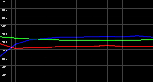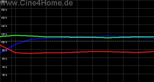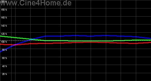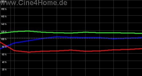 Sowohl die Rot-, als auch Blauabweichungen halten sich in einem tolerablen Rahmen, so dass keine großen Farbverfälschungen im laufenden Filmbetrieb auszumachen ist. Den leichten Blauüberschuss verzeiht das Auge auch leichter, als einen Grün- oder Gelbstich (wie zuvor).