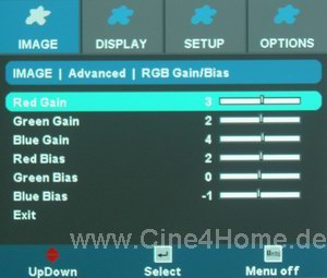 Der Rotmangel von ca 30% ist recht stark, so dass die Bilddarstellung zu kühl ausfällt. Gerade Gesichtsfarben verlieren deutlich an Natürlichkeit. Wir haben uns im Bildmenü daher umgeschaut, ob man die Farben einfach, ohne große Sensor-Einmessung, unkompliziert verbessern kann. Und tatsächlich, bei unserem Testgerät reichte es, die "Color Temp" im erweiterten Bildmenü auf "0" zu setzen. Mit dieser Einstellung opfert der Projektor zwar eine Teil seiner Helligkeit, ist aber gut angenähert auf die D65-Farbtemperatur geeicht.