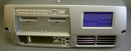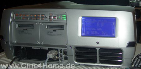 Auf der rechten Seite befinden sich die beiden Lampenschächte, jedes Leuchtmittel kann separat gewechselt werden. Leuchtdioden zeigen dabei an, welche Lampe im Betrieb ist. Das duale Lampensystem ist aufwändig und in dieser Form kaum noch einmal zu finden: Jede Lampe verfügt über ihr eigenes Farbrad, im Dualbetrieb werden die Räder aufeinander synchronisiert.