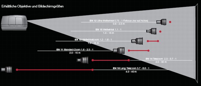 Wie bereits erläutert, bietet der Projektor mit seinen Wechselobjektiven für jeden Einsatzort die passende Variante. Gleich sechs dieser Varianten stehen zur Auswahl, von der Ultra-Weitwinkel Variante mit 0,75:1 für die Rückprojektion bis zum Super-Telezoom mit 3,7 – 6,5:1 ist alles vorhanden.