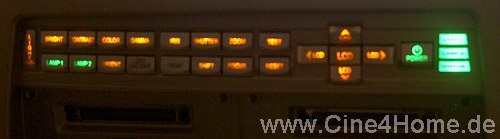 Die Fernbedienung wirkt sehr elegant und dabei dennoch gut strukturiert. In dunklen Räumen sorgt eine dezente blaue Beleuchtung für die notwendige Lesbarkeit. Die Reichweite des Infrarotsenders ist angemessen groß und funktioniert auch reflektiv über die Leinwand.