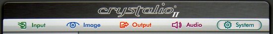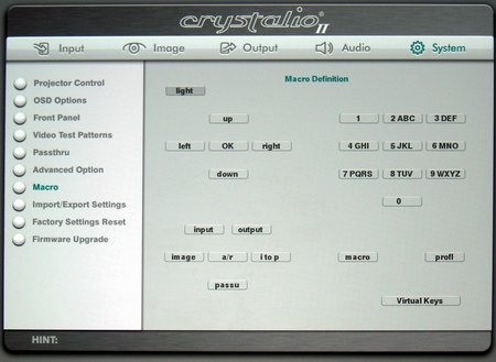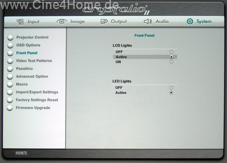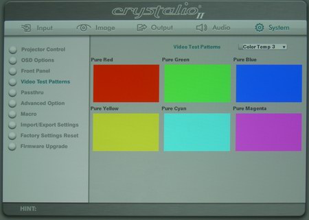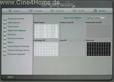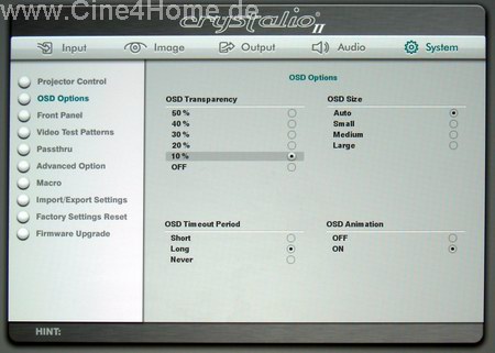 Das duale System aus getrennter Projektor- und Scaler- Programmierung wirkt auf den ersten Blick ein wenig umständlich und verwirrend. Bei der Erstinstallation muss man gleich mit zwei Fernbedienungen "jonglieren", wobei der kleine Kontrollmonitor an der Decke nur schwer abgelesen werden kann. Doch nach der Anpassung von Kontrast und Helligkeit (diese Optionen fehlen in der Crystalio "Projector Control" Rubrik), kann man die Bedienung des Projektors zur Seite legen und es reicht, ihn ausschließlich über den externen Scaler zu steuern. Dessen hervorragende Menüs mit schier unglaublich vielen Bildparametern ist dabei ein Traum für jeden Heimkinofan. Nahezu alles kann hier beeinflusst werden, von der Signalanpassung über die Bildaufbereitung bis hin zur freien Programmierung des Ausgangssignals in Übertragungsart und Frequenz, es wurde nichts vergessen. Besonders Perfektionisten können sich hier nach Belieben austoben. Ist einmal alles optimiert, so sorgen zahlreiche Speicheroptionen und sogar ein automatisierter Abruf der zum Signal passenden Bank für optimalen Komfort.
