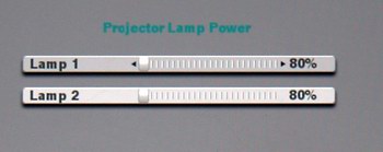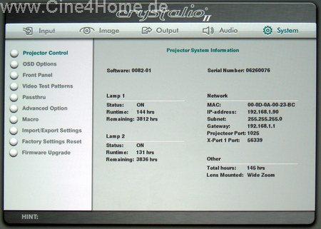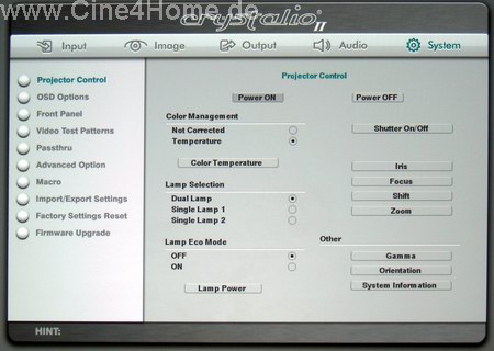 Der Screenshot oben zeigt, wie professionell die Aufbereitung ausfällt: Ein übersichtlicher Menübaum gruppiert die Parameter in verschiedene Themenbereiche. Aber auch hier sind die direkten Projektorenfunktionen nicht gerade üppig: Mit "Color Management" kann die Farbtemperatur ausgewählt werden. "Not Corrected" bringt das native Lampenspektrum auf die Leinwand, zusätzlich kann die Farbtemperatur direkt in Kelvin angegeben werden. Für die Heimkinonutzung ist das 6500K / D65 Setting die richtige Wahl, wie genau es ausfällt, untersuchen wir im ausführlichen Bildtest. Interessant ist die Lampensektion, hier kann man aussuchen, ob beide Lampen gleichzeitig oder eine allein für das nötige Licht sorgt. Dabei können die Lampen in einen sparsamen Ecomodus geschaltet und sogar nahezu stufenlos gedimmt werden, und zwar jede für sich.