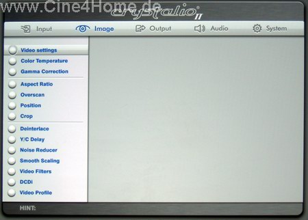 Durch dieses System lässt sich stets eine optimale Anpassung an die individuellen Lichtbedürfnisse durchführen. Ergänzend kann mit der Funktion "Iris" die Streulichtblende in der Optik ebenfalls in unzähligen Stufen geöffnet oder geschlossen werden. Unpraktisch ist es dabei, dass der jeweilige Öffnungsgrad nicht angezeigt wird. Dadurch kann die Iris nur "nach Gefühl" justiert werden, was bei Verwendung verschiedener Setups (z.B. Tag und Nacht) schnell störend wird. Ebenfalls für die Bilddarstellung relevant ist die "Gamma"-Funktion, sechs verschiedene Presets stehen hier zur Auswahl: "Film 1/2, Video 1/2, Computer 1/2". Im Laufe des Bildtests werden wir untersuchen, welches Preset für welchen Einsatz geeignet ist. Die übrigen Funktionen der Rubrik sind selbsterklärend, sie beschäftigen sich mit der Installation (Fokus, Zoom, Lensshift etc.). Gesteuert werden die Menüs des Videoprozessors übrigens nicht mit der Fernbedienung des Projektors, sondern mit einer zweiten, der Crystalio II - eigenen.