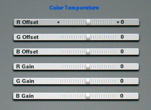 Jedem Leser sollten Funktionen wie "Brightness", "Contrast", "Sharpness" etc. bekannt sein und sie bedürfen keiner weitere Erläuterung. Weiter geht es mit "Color-Temperature". Hier können nach dem klassischen "Gain / Offset" Prinzip die Grundfarben einzeln auf die Bildquelle hin optimiert werden.