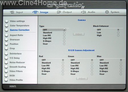Das Gamma-Menü ist besonders vielseitig und daher lobend hervorzuheben. Hier können weitere Anpassungen vorgenommen werden, sogar für jede Grundfarbe einzeln. Wir überspingen die nächsten Rubriken "Aspect Ratio, Overscan, Position und Crop", da diese selbsterklärend sind. Mit ihnen können der darzustellende Bildausschnitt und die Bildlage beeinflusst werden. Interessant und nahezu einzigartig ist wiederum die Rubrik "De-Interlace":