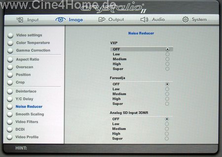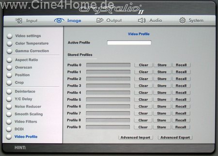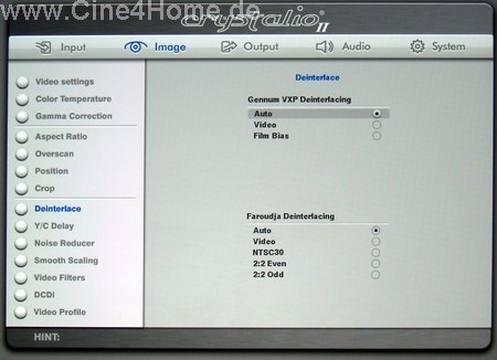 Dort kann man das De-Interlacing beider Videoprozessoren des Crystalio II festlegen. Für den Gennum-VXP-Prozessor, der für die HD-Aufbereitung zuständig ist, stehen Video, Film und Auto zur Verfügung, für den Faroudja, der bei SD-Material optional zur Verfügung steht, wird bei Filmmaterial noch zusätzlich zwischen PAL und NTSC unterschieden.