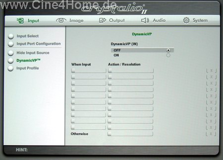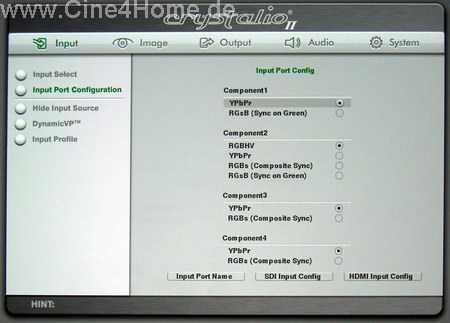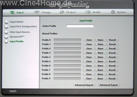 In der Rubrik "Input" kann genau festgelegt werden, welche Signalart an welchem Eingang des Videoprozessors anliegt. Für die digitale Bildübertragung, die im Heimkino immer wichtiger wird, ist die Option "HMDI Input Config" besonders wichtig, hier kann der Signalraum "Enhanced / Normal" festgelegt werden. Auch eine "Auto"-Option steht zur Verfügung, die bei unseren Praxistests aber nicht immer zuverlässig arbeitete. Wie schon im "Image"-Menü können auch in dieser Rubrik alle Konfigurationen in diversen Speicherbänken abgelegt werden.
