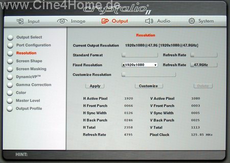 Wirklich beeindruckend wird es dann im "Resolution"-Menü (Screenshot oben): Hier bietet der Projektor derart viele Funktionen zur Signalbeeinflussung, wie es sonst nur bei hochwertigen PCs möglich ist. Zwar erfordert dieses Menü ein gewisses Maß an Fachwissen, doch letztendlich kann die Signalausgabe auf jedes Display hin, und sei es noch so exotisch, angepasst werden. Ärgerlich ist dabei nur, dass sich lediglich der HDMI-2 Port in der Bildfrequenz frei programmieren lässt. HDMI1 ist auf 50Hz bzw 60Hz festgelegt, und das obwohl der Action3 Projektor auch 48Hz verarbeitet, was für den Reverse-Pulldown notwendig ist. Mehr dazu im Laufe des Bildtests.