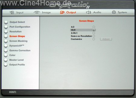 Auch die Rubrik "Screen Shape " geht über das normale Maß eines Projektors hinaus. Neben klassischen Bildformaten wie 16:9 und 4:3 können auch Kinoformate ausgesucht und sogar eigene Seitenverhältnisse festgelegt werden. Dies sind besonders gute Neuigkeiten für Nutzer von Anamorphoptiken zur verlustfreien Darstellung von 21:9 Kinomaterial. In diesem Fall rechnet der Scaler die Auflösung formatfüllend hoch, was in Anbetracht der hervorragenden Videoprozessoren entsprechend gut funktioniert.