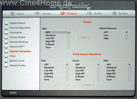 An dieser Stelle muss ergänzt werden, dass die Farbanpassung nicht im Projektor erfolgt, sondern direkt im Bildsignal durch den Scaler. Gleiches gilt für die Rubrik "Gamma-Correction":