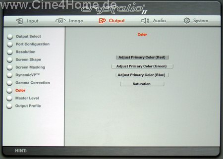 Im "Color"-Menü kann schließlich der Farbraum des Bildes angepasst werden. Dies ist eine sinnvolle Funktionen, uns wäre aber eine Farbraumanpassung im Projektor lieber gewesen. Denn wenn sich die nativen Grundarben des Projektors nicht beeinflussen lassen, schränkt dies die Möglichkeiten weitgehend ein.
