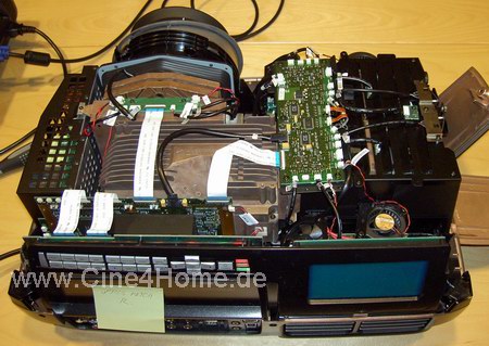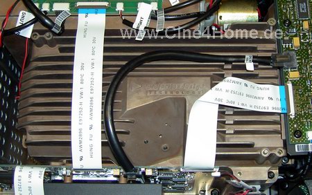 Nimmt man den Deckel ab, so erkennt man einen gut strukturierten, modularen Aufbau: Am linken Rand befindet sich, solide abgeschirmt, die Stromversorgung des Projektors, daneben die Lightengine, auf der rechten Seite die Lampenkammern. Ja, Sie haben richtig gelesen, Plural, denn im Action3 sorgt nicht nur eine Projektionslampe für das notwendige Licht, sondern bei Bedarf gleich zwei mit jeweils 250W maximaler Leistung. Vom Anwender kann dabei bestimmt werden, ob eine oder zwei Lampen angeschaltet sind, und mit welcher Leistung sie arbeiten sollen (stufenlos regelbar). Dadurch ergibt sich bereits eine ungemein hohe Flexibilität in der Lichtleistung, die Rückschlüsse auf die universellen Eigenschaften des Projektors zulässt, bis zu 2500 Lumen soll der Projektor so ermöglichen. Dies wäre unter normalen Heimkinobedingungen selbst für eine Tageslichtprojektion mehr als genug.