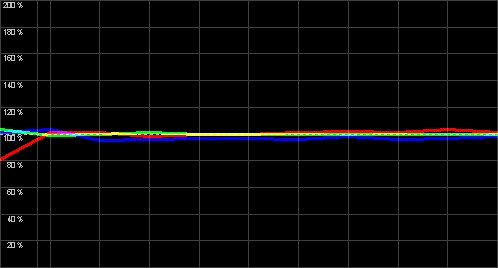 Obiges Diagramm zeigt den Weißabgleich des "6500K" Settings des Action3. Besser kann eine Werksabstimmung kaum ausfallen, der Projektor trifft ohne weitere Nachkorrektur die Videonorm auf den Punkt. Dadurch wirkt die Farbdarstellung im Filmbild absolut natürlich. Besonders wird dies an Gesichtsfarben und Naturaufnahmen deutlich, sie wirken glaubwürdig realistisch und entsprechen dem Kinooriginal. Noch immer schaffen es nur wenig Hersteller, eine so genaue Farbeinmessung ab Werk zu realisieren, weshalb wir das Ergebnis an dieser Stelle noch einmal ausdrücklich lobend hervorheben wollen. Von einem Profi-Beamer kann man dies aber auch erwarten...