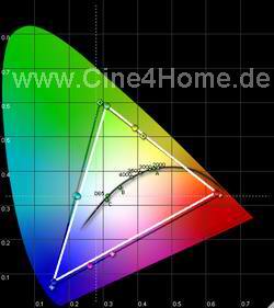 Wie im Diagramm oben zu erkennen, ist der Weißabgleich gleichmäßig über alle Helligkeiten hinweg. Er trifft allerdings nicht genau die D65 Norm, sondern weist einen gewissen Blau-/Rotüberschuss auf. Für einen günstigen Einstiegsprojektor ist dieses Ergebnis als tolerabel anzusehen. In jedem Fall kann ein perfekter Weißabgleich mit entsprechender Erfahrung erzielt werden, da der Projektor über mehr als genug Einstellparameter verfügt. Neulinge sollten hier auf die Kompetenz renommierter Fachhändler bauen.