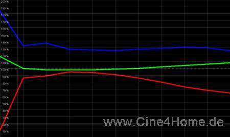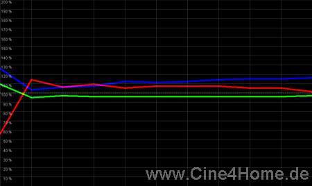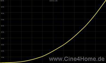 Die Gammaanstieg des Pure-Cinema Modus beträgt wie das Diagramm oben belegt 2,45. Dieser Wert entspricht gängiger Praxis, ist aber eher für heimkinooptimierte Räume mit dunklen Wänden zu empfehlen. Wer einen flacheren Anstieg für hellere Räume bevorzugt, kann die Gammaverteilung nahezu stufenlos zwischen 2.0 und 2.4 durch die zahlreichen Bildparameter justieren.