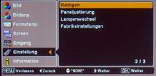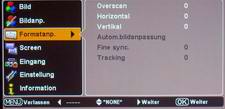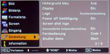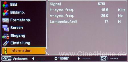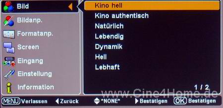 2.2 Menüs Sehr zum Positiven haben sich die On-Screen-Menüs des Projektors entwickelt. Zwar bieten sie nicht wesentlich mehr Funktionen als beim Vorgänger, doch sind sie grafisch nun deutlich übersichtlicher gestaltet und strukturiert. Auch ohne Bedienungsanleitung findet man sich schnell intuitiv zurecht. Der Menüaufbau wurde ebenfalls deutlich beschleunigt und sorgt so für eine absolut Frust-freie Bedienung. In sieben verschiedenen Hauptrubriken sind alle Funktionen unterteilt: „Bild“, „Bildanpassung“, „Formatanpassung“, „Screen“, „Eingang“, „Einstellung“ und „Information“.
