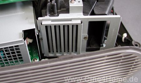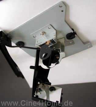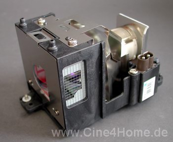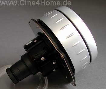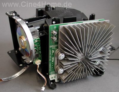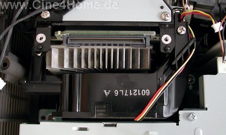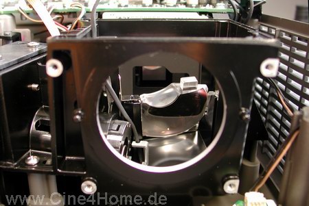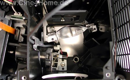 Die Lampe wirkt mit ihrem Frontblech ein wenig exotisch, macht aber einen soliden und "explosionssicheren" Eindruck. Getauscht wird sie auf der Projektorenunterseite, was im Falle des Wechsels eine Demontage von der Deckenhalterung notwendig macht.