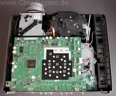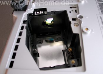 Nach Abnehmen des weißen Deckels (Vorsicht, viele Schrauben und zerbrechliche Plastikclips) überrascht der innere Aufbau: Der gesamte Lichtweg befindet sich im vorderen Drittel des Gehäuses, der größte Teil wird von der Hauptplatine und dem Netzteil belegt. Die Hauptplatine ist Sharp-typisch sehr aufgeräumt mit wenig Bauteilen.